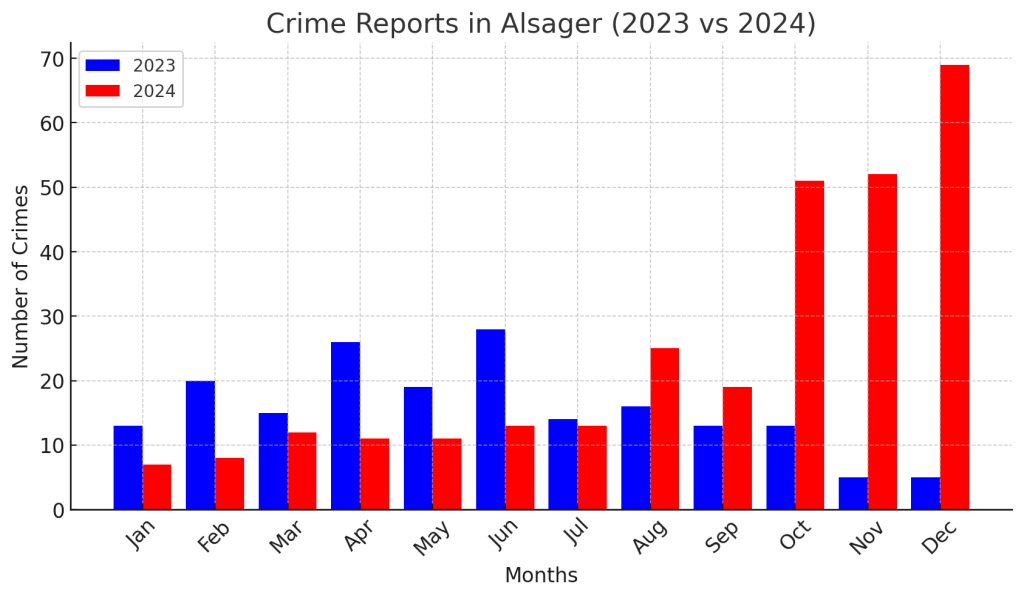 The final three months of 2024 were a key contributor, accounting for 59 per cent of the overall crimes reported during the year. December was the worst month on record for crime in Alsager with 69 offences reported to the police.